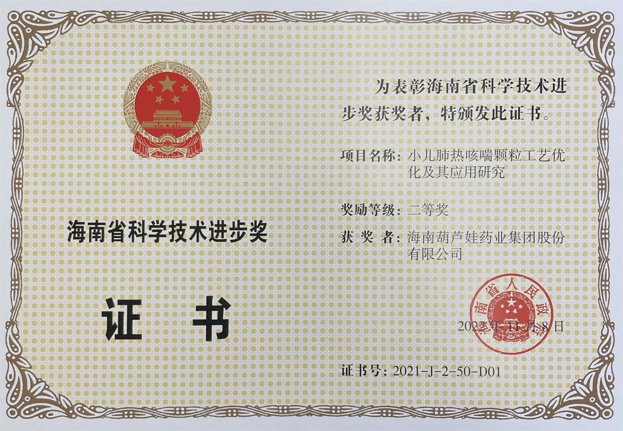 为此,小儿肺热咳喘颗粒的制备方法获得了第二十一届中国专利优秀奖(2019年),专利申请号:ZL201010134951,此次作为专利技术的应用,获得了2021年度海南省科学技术进步奖二等奖。在此之前,pg电子牌小儿肺热咳喘颗粒还多次被授予“临床价值中成药品牌”、“中国连锁药店最具合作价值单品”,荣登“中国医药品牌榜”。