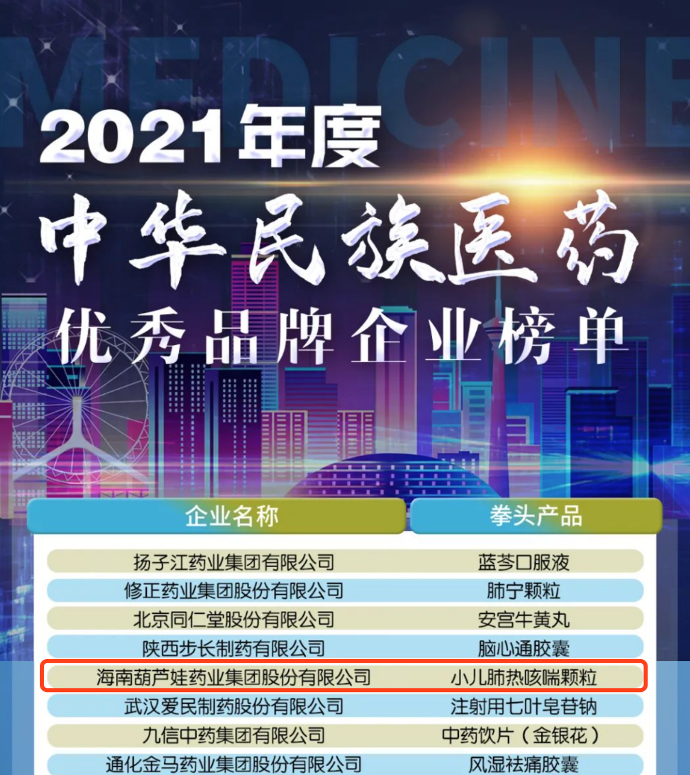 12月29日,全国工商联医药业商会发布了“2021年度中华民族医药优秀品牌企业榜单”,pg电子药业集团凭借黄金单品小儿肺热咳喘颗粒(4克)实力登榜。